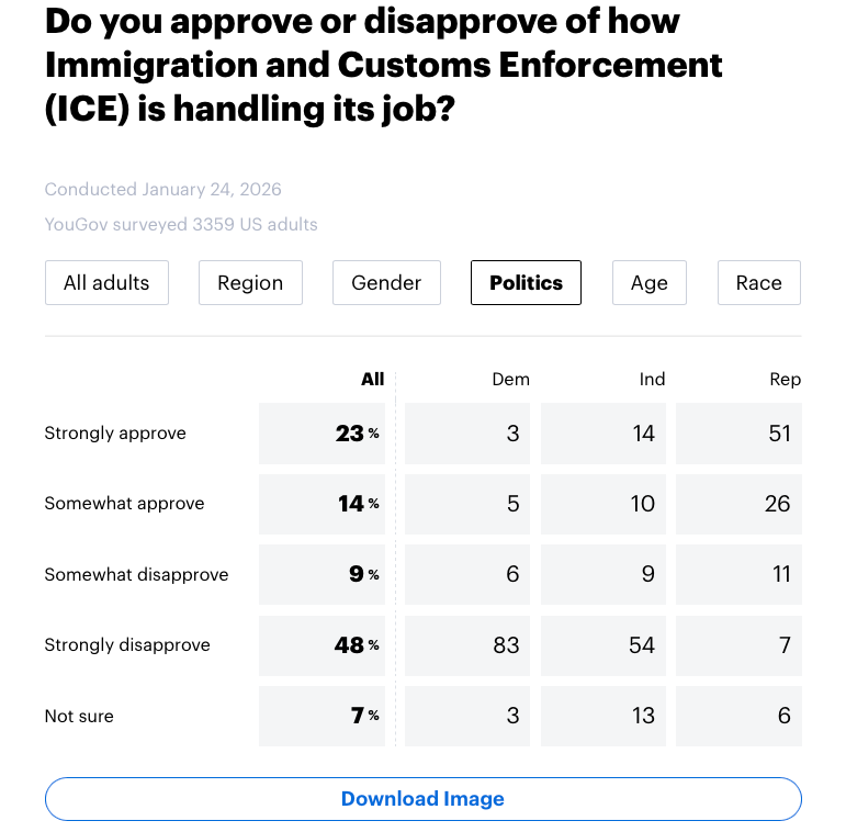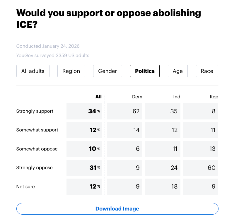 Considering many Americans had not even heard of ICE killing Alex Pretti by Saturday afternoon (when this poll was fielded), I think these numbers are going to get even worse for the administration as time goes on. Support for abolishing ICE has been increasing over the last year and recently hit an all-time high.