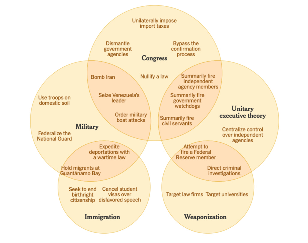The New York Times’ Charlie Savage and Lazaro Gamio catalog how Trump is pushing to expand presidential power — a systematic breakdown of his attempts to centralize authority over the executive branch, claim powers from Congress, and weaponize government against adversaries.