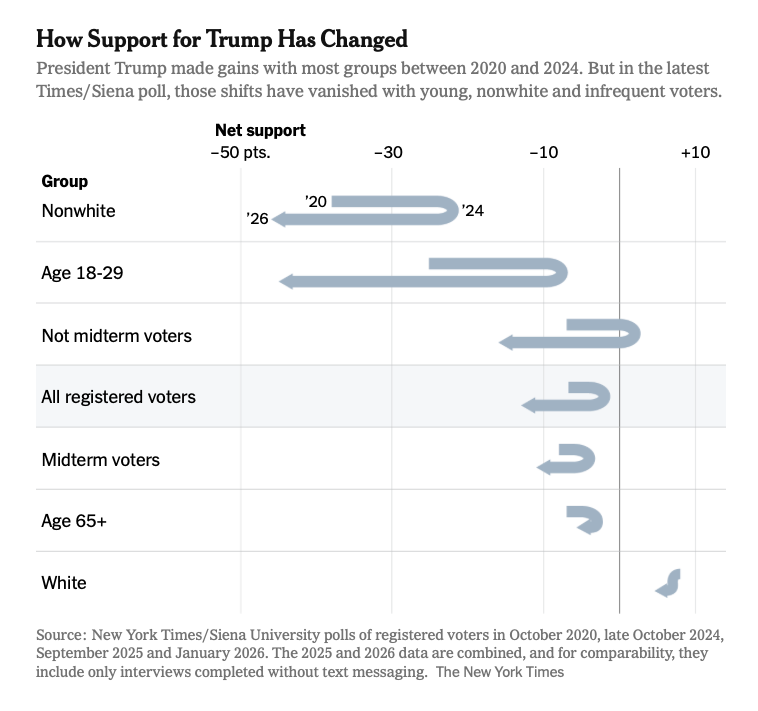 This week brought a new New York Times/Siena University poll with numbers that confirm what Strength In Numbers has been reporting since early 2025: Trump’s 2024 coalition has come undone. Young voters, non-white voters, and low-turnout voters who swung to Trump from 2020 to 2024 have swung back against him in force. In many cases, these groups are even more anti-Trump now than they were ahead of the 2020 election.