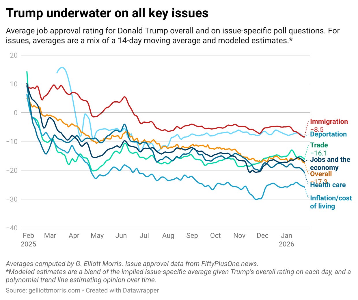 I will also be keeping an eye out for new polling on ICE/immigration enforcement/deportations after federal agents shot and killed a second person, Alex Pretti, in Minnesota on Saturday, Jan. 24. One early poll from YouGov, fielded on Saturday, shows abolishing ICE at +5 support among all adults, and +12 among political independents: