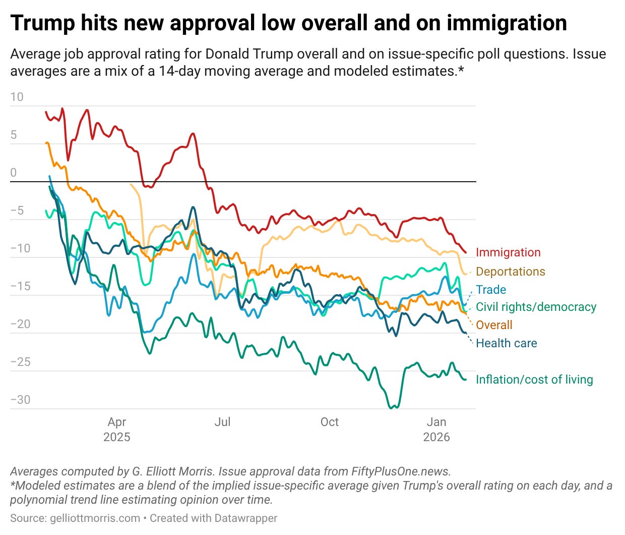 The causality here is no mystery. The trend line for Trump’s deportation policy shows a year of steady erosion — similar to the constant march down in his overall rating — and then a sharp acceleration over the past month as the ICE shootings in Minnesota dominated headlines.
