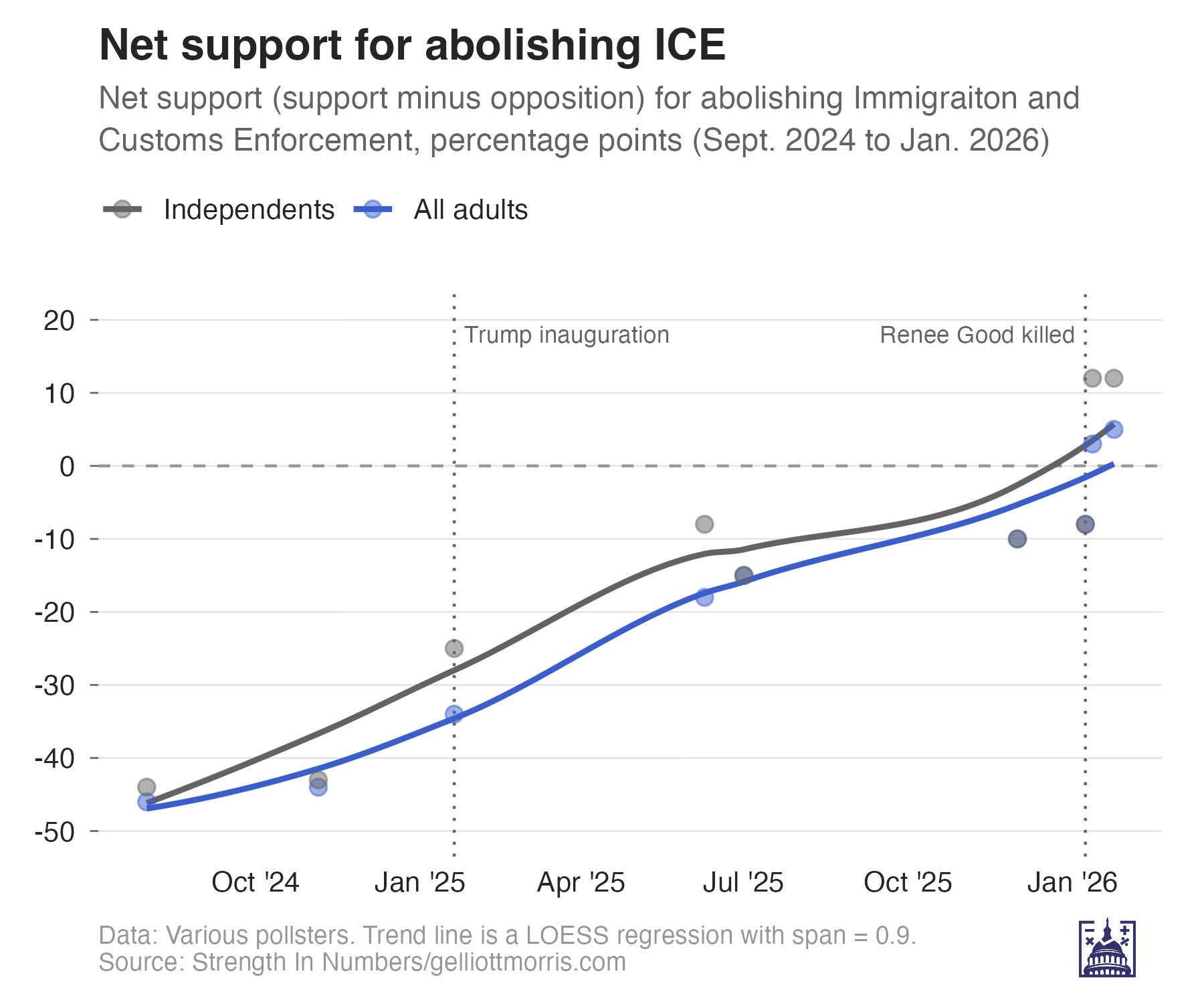 The way I have been thinking about this is that by pushing extreme enforcement measures that are now resulting in the deaths of innocent American citizens, Trump has changed the images people attach to the word “immigration” in their heads. When “immigration” doesn’t mean “pictures of migrants under an overpass in south Texas” but “ICE officer killing a woman in her car and calling her a ‘fucking bitch’” or “regular guy being shot 10 times in the back after being tackled to the ground and disarmed”, that’s going to change how people view the issue.