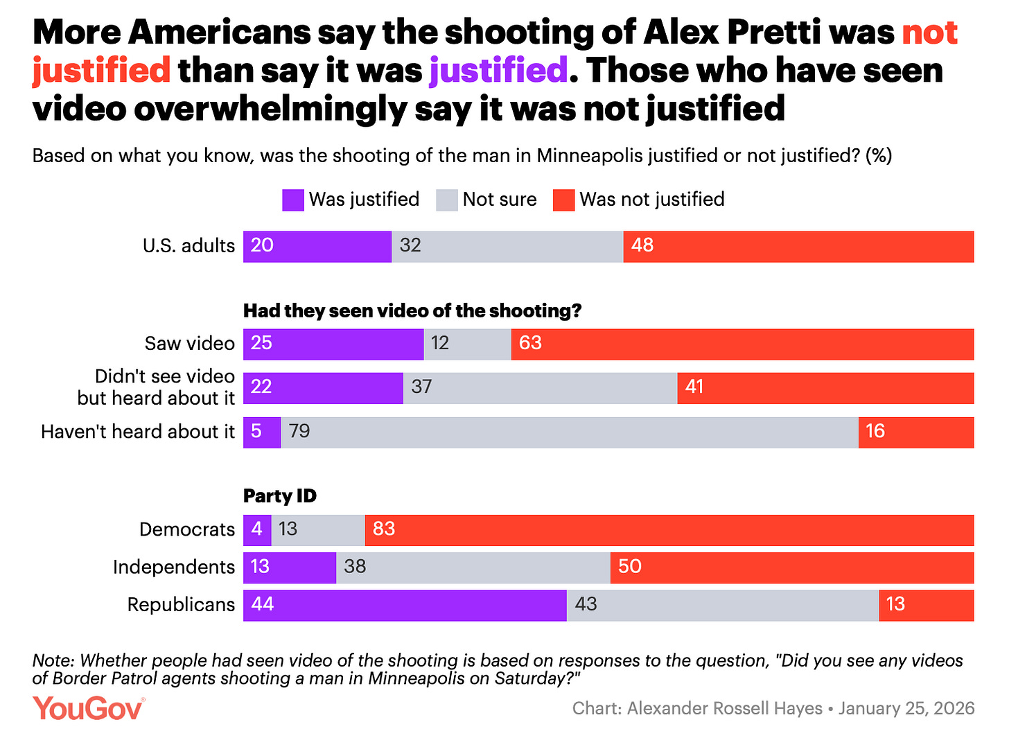 We can see this in the data. YouGov found on Jan. 24 that 48% of Americans believed the shooting of Alex Pretti was not justified, compared to just 20% who said it was. Among respondents who reported they had seen video of Pretti being killed, the margin widened to 63% unjustified vs 25% justified. Even among Republicans, only 44% call the shooting justified: