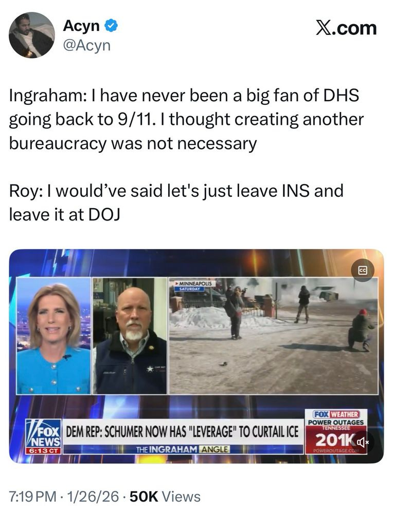 Backlash to Trump isn’t just coming from the left. This weekend, classical liberal and The Atlantic contributor Jonathan Rauch published a piece explicitly calling Trump a fascist. The Wall Street Journal’s editorial board (recently anti-Trump on occasion, but certainly not progressive) called for ICE to “pause” in Minneapolis. Fox News’s Laura Ingraham even appears to be backpedaling on DHS existing as its own agency!