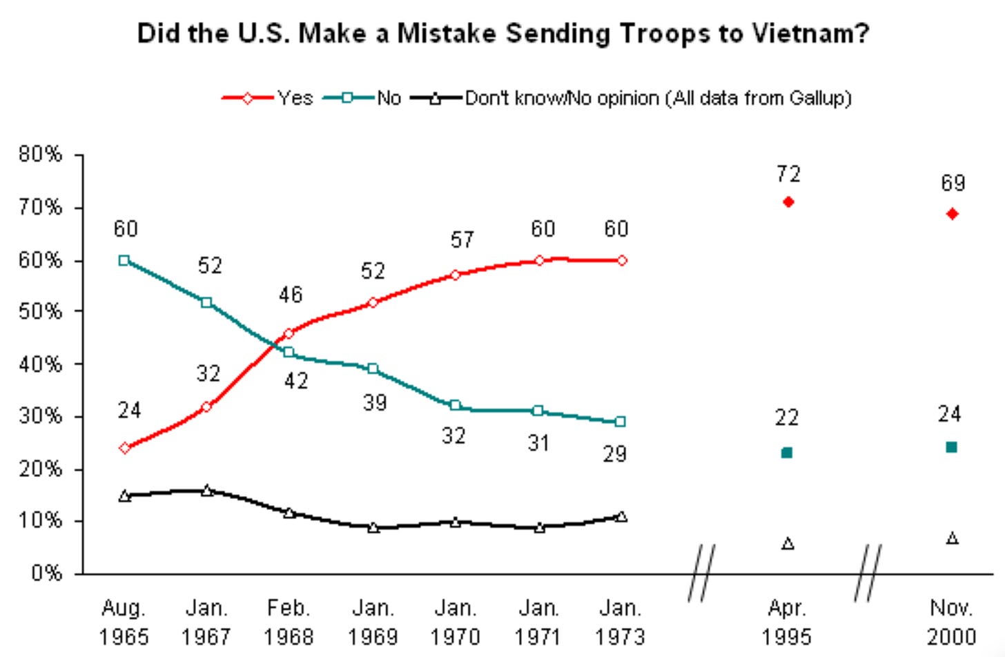 For Page and Shapiro, the classic example of a tipping point is the Tet Offensive in Vietnam in Jan.-Feb. 1968. Before Tet, a majority of Americans supported continuing the War, and official messaging from the U.S. government emphasized progress toward goals. But then came media reports that things were not as they seemed, and the U.S. was “mired in stalemate“ against the North Vietnamese. Critical coverage was widely received, directly relevant to beliefs about whether the war was winnable, sharply discrepant with prior optimistic narratives, and credible through vivid reporting and the general respect for news anchors at this point in American history. By April 1968, the share saying U.S. action in Vietnam was a “mistake” jumped to 48%, up from 37% a year prior, and a plurality of Americans opposed the war. By the autumn of 1968, support had fallen to the mid-30s, and opposition surpassed 50%.