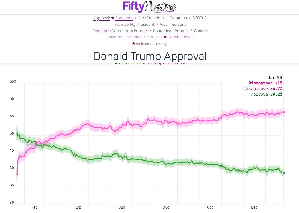 First, consider the trajectory in Donald Trump’s overall approval rating. His net rating — the difference between the percent of Americans who approve of his presidency and the percent who disapprove — is -17.5 in the FiftyPlusOne.news aggregate, a record low for his second term. But the more telling story is what’s happening on immigration specifically. And his approval percentage also hit a new low this week, at 39.2% of all adults.