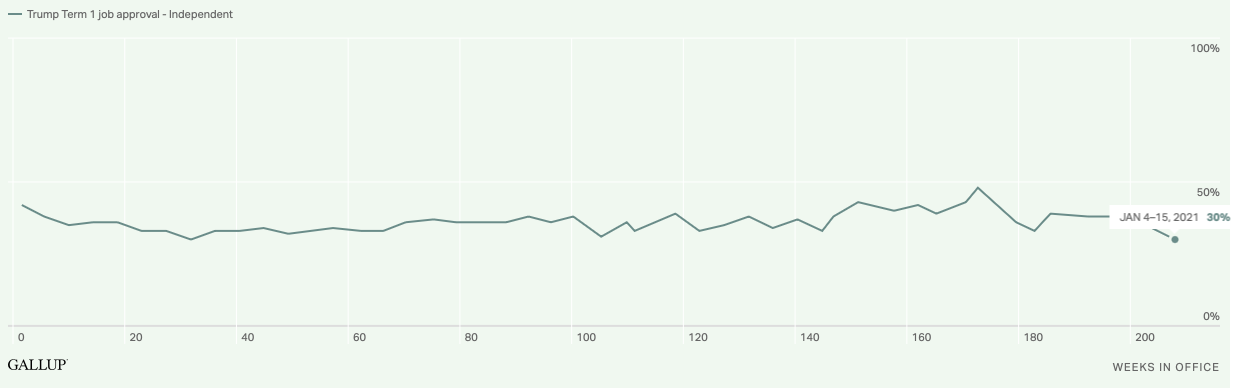 As it turns out, 29% among independents is also a record low for Trump, according to Gallup. Here is their trend for Trump among indies in his first term. He bottomed out at 30% after the attempted coup on Jan. 6, 2021.