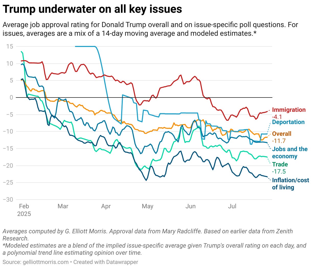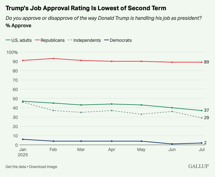 The poll I saw circulating most online this week is a new Gallup survey of Trump’s first six months in office. Gallup finds Trump with a 37% approval rating among adults (a new low across all pollsters) and losing ground on all issues.
