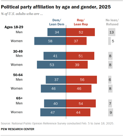 The Pew Research Center released the results of its annual high-response-rate political benchmarking survey. The thing everyone cares about is party ID: Republicans have a 46-45 advantage, which, depending on how you’re rounding, is one point smaller than their advantage in 2024. The long-term trend is not good for Democrats (the public was D+6 in 2020), but that’s not news. Pew does have a graph of party by gender that reinforces the trend against Democrats among young men: