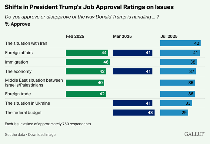Strikingly, Gallup finds that just 38% of Americans approve of how Trump is handling immigration, and 37% approve of his job on the economy — the two issues that probably won him the 2024 election. Trump has lost double digits on handling the federal budget and 6 points on trade/tariffs.