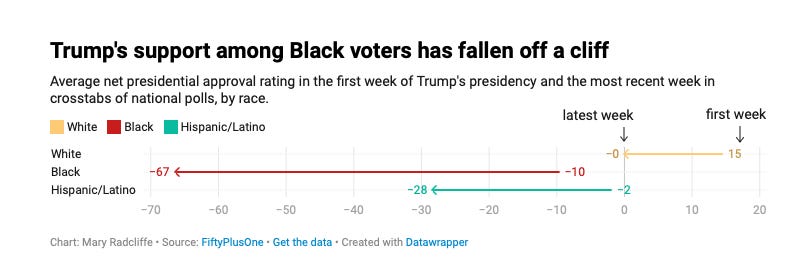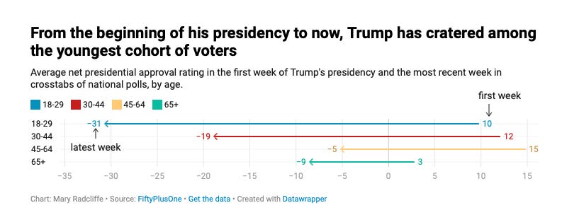 I have been writing about Trump’s lagging margins with young people, for example, since April, and touched on it again with new data from August. It was clear to anyone with their eyes open that Trump had already lost ground with most demographic groups. In this article, my colleague at FiftyPlusOne.news, Mary Radcliffe, compiled crosstabs for Trump’s approval rating and showed the drop-off among key groups: