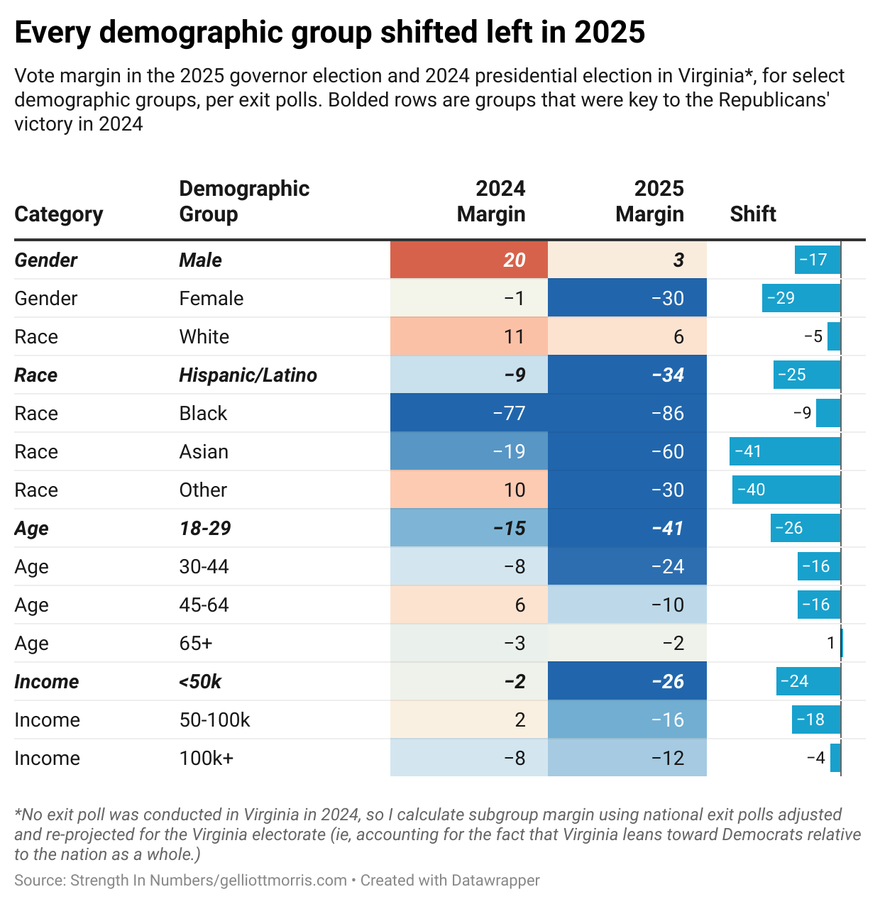 In the table below, I show the change in GOP vote margin for key demographic groups from the 2024 presidential election to 2025 elections (in Virginia):2