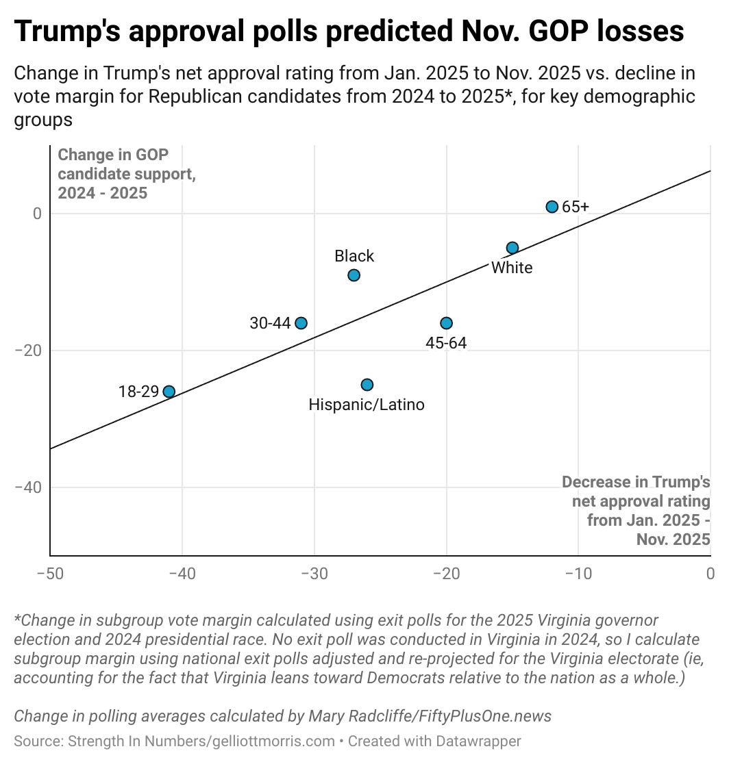 While the relationship between Trump’s changing approval polls and shifts in GOP vote margin from 2024 to 2025 is not 1:1 (it’s closer to 1:0.5), there is a strong relationship between the two. A group that moved 20 points against Trump in his net approval rating moved on average 11 points against Republicans in vote margin, per the exit polls.