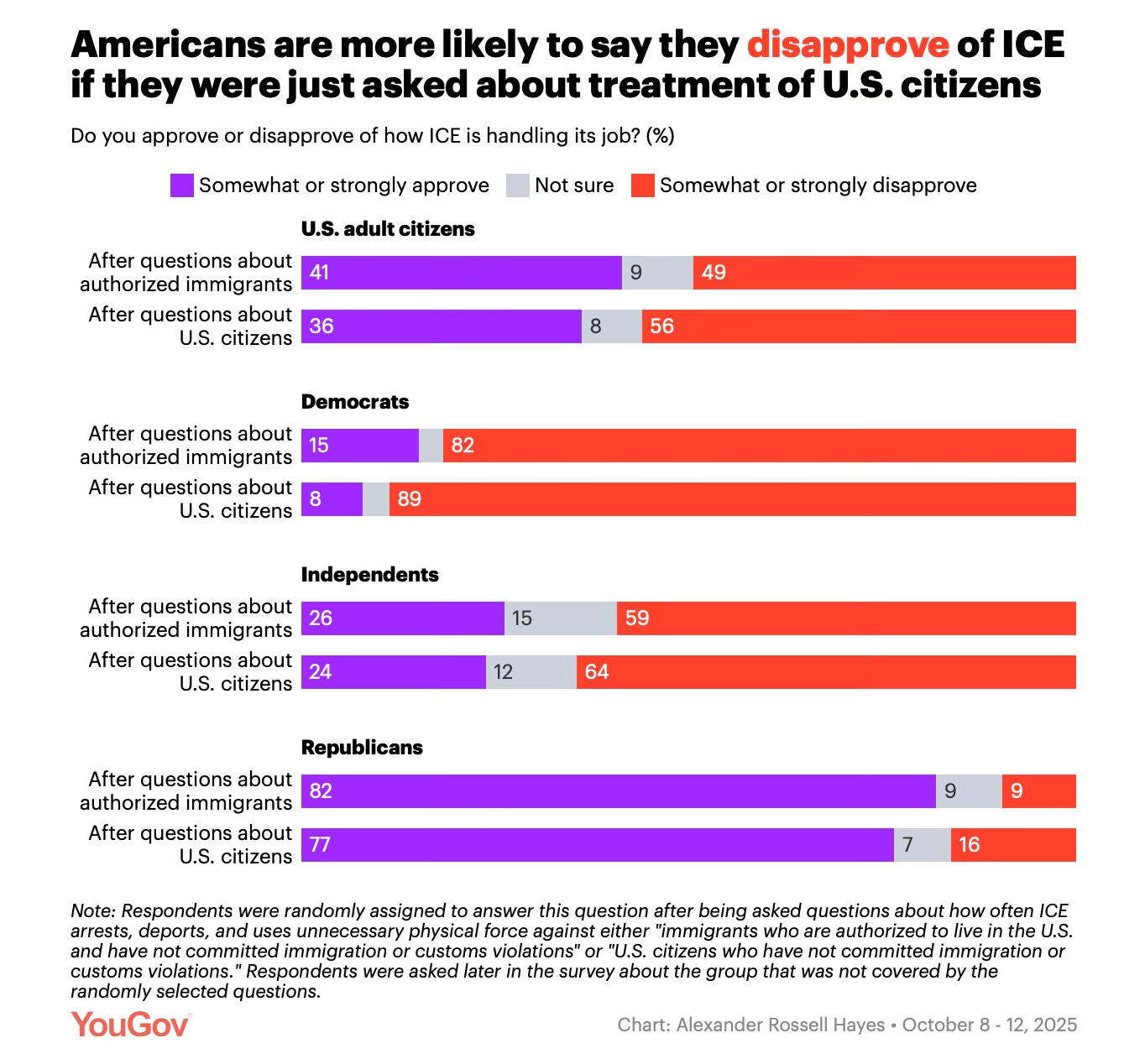 One thing I like about this experiment is that YouGov is not giving any new information to respondents — e.g., in the form of long question wording with added context. For example, in a standard survey experiment, a researcher might alternate between asking respondents a straight-up approval ask and a question that begins with “Recently, during an immigration raid in New York, ICE arrested four U.S. citizens for being in the country illegally, which it does not have the legal authority to do. Do you approve or disapprove of the job ICE is doing?”)