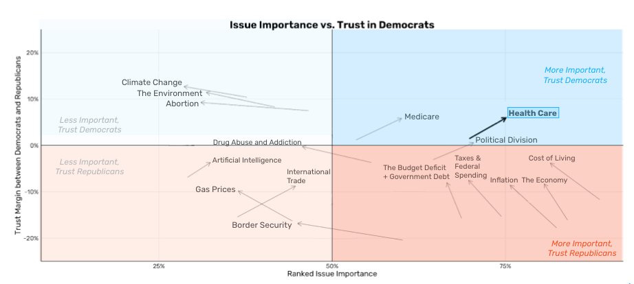 Democratic data scientist David Shor says: “The issue landscape has changed dramatically over the last year - Democrats successfully have simultaneously raised the salience and expanded our trust advantage on our best issue (healthcare) \*and\* dramatically improved our trust advantage on the cost of living and the economy” and posts this graph: