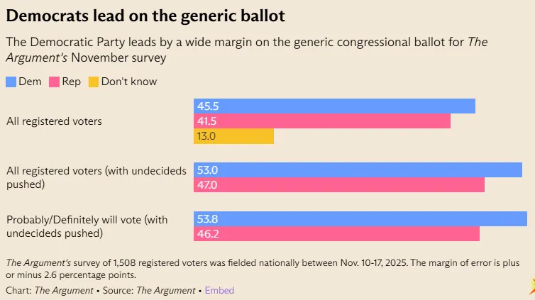 New polling by The Argument shows Democrats gain on the generic ballot when people responding “don’t know” are forced to make a decision. Very similar to the findings in part 1 of this newsletter.