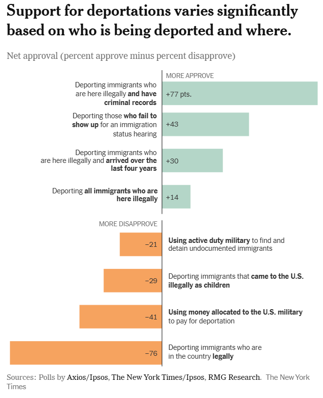 The New York Times looks at immigration polling again and reaffirms a finding from this newsletter: the more specific pollsters get about Trump’s immigration policy, the more unpopular it gets.