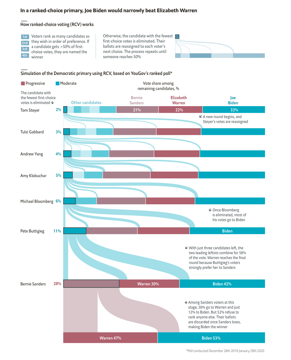 I answered this exact question for The Economist back in February 2020. We asked Democratic respondents to a national poll to rank the candidates for the Democratic nomination, and then simulated what the rankings would look like at each round. We found that left-leaning voters exhausted their ballots (they didn’t rank every single option, so their vote got discarded early after just a couple rounds or ranking) early, which would have ended up in Biden beating Warren in a 53-47 final round: